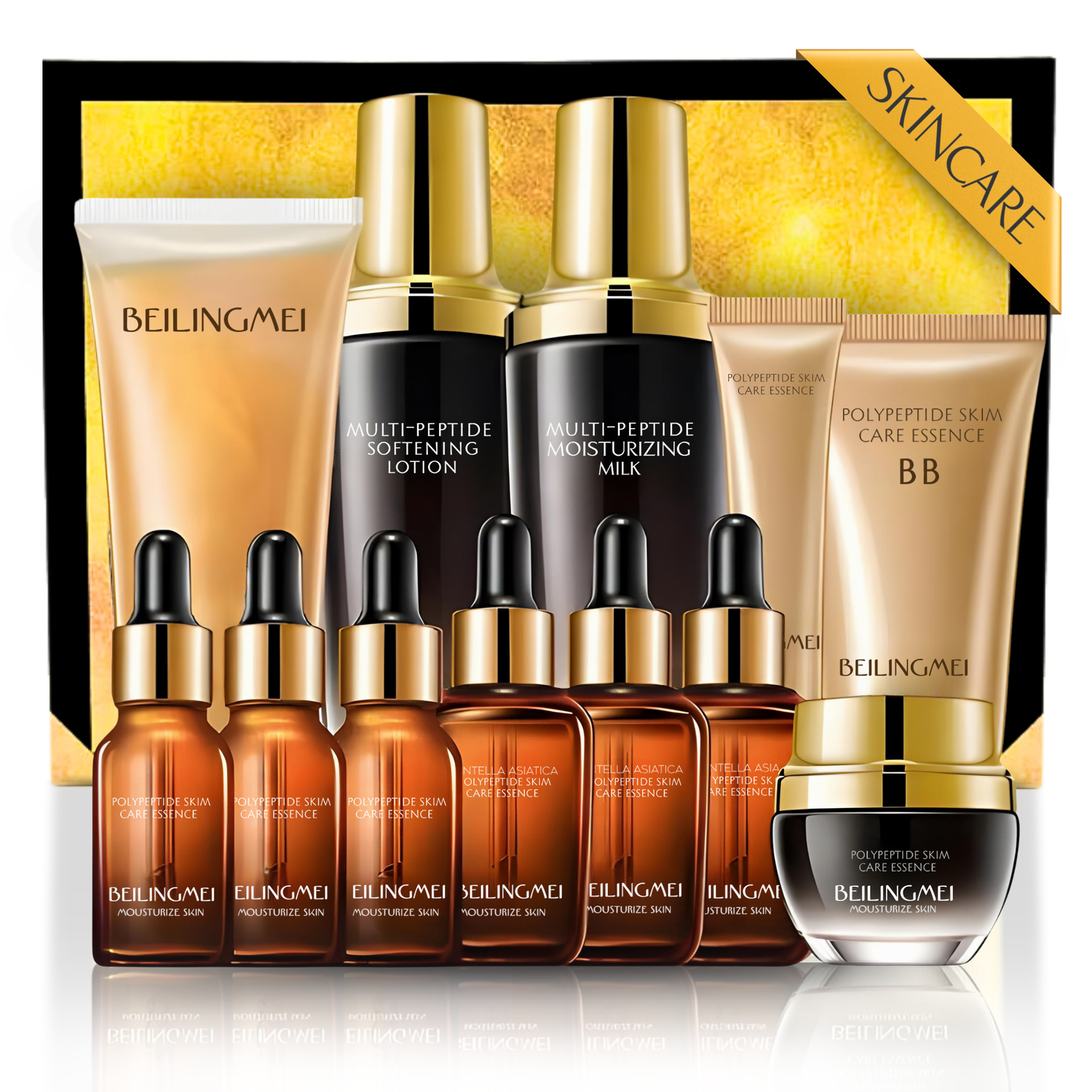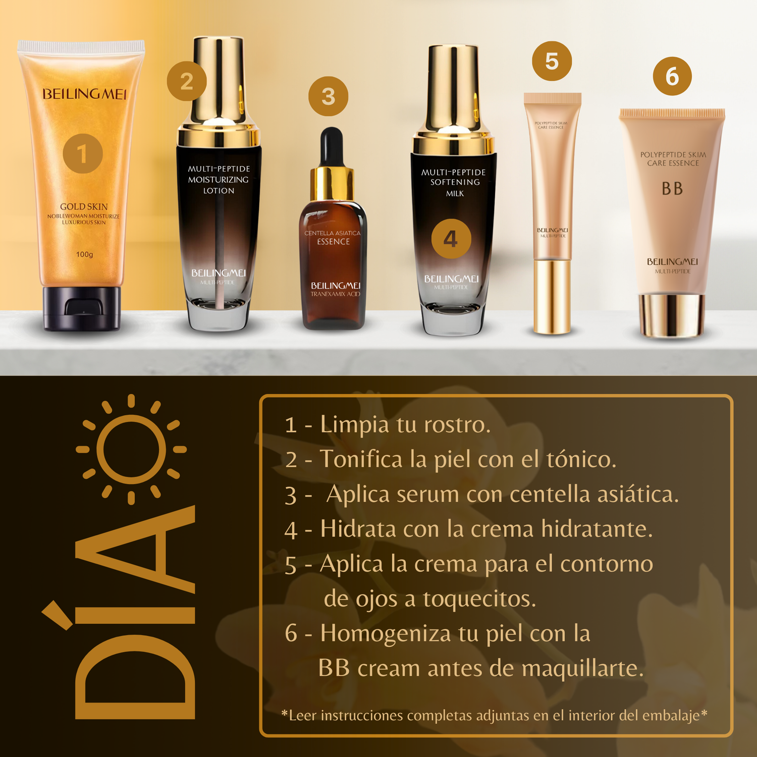 Formulado con ingredientes avanzados como la centella asiática y esencia polipeptídica, este kit mejora la textura de la piel, estimula el colágeno, reafirma y aporta luminosidad natural.