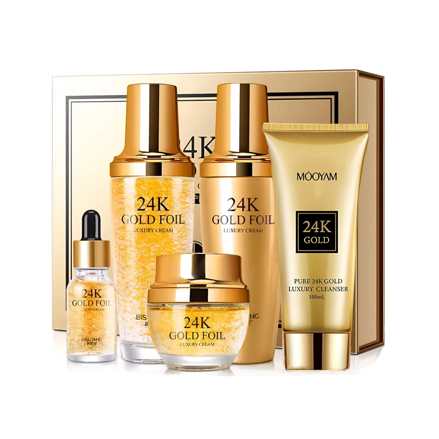Este exclusivo set de 5 productos con Oro de 24K ofrece todo lo necesario para una rutina facial diaria que hidrata, reafirma y revitaliza la piel. Su fórmula avanzada ayuda a reducir la apariencia de arrugas, mejorar la elasticidad y aportar un brillo natural.