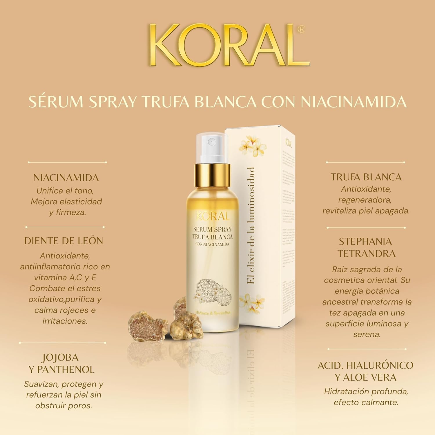 Descubre una experiencia única de hidratación y luminosidad con nuestro Serum en Spray, formulada con extracto de Trufa Blanca, un ingrediente exclusivo con alto poder antioxidante. Su combinación con niacinamida ayuda a unificar el tono de la piel, restaurar la elasticidad, mientras que el ácido hialurónico proporciona una hidratación profunda que suaviza líneas de expresión.