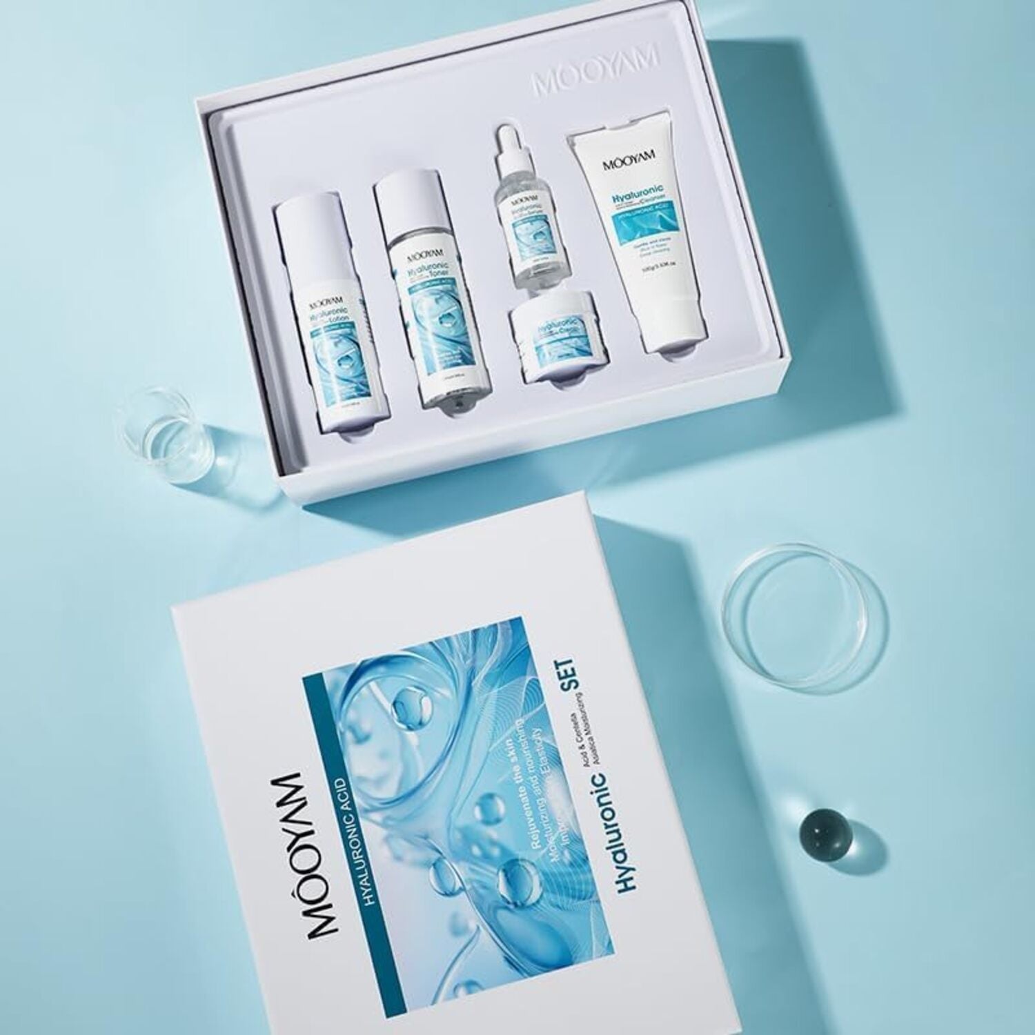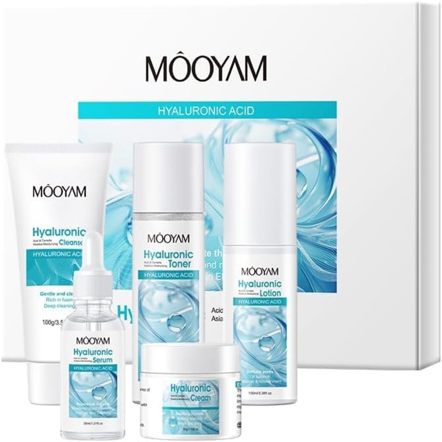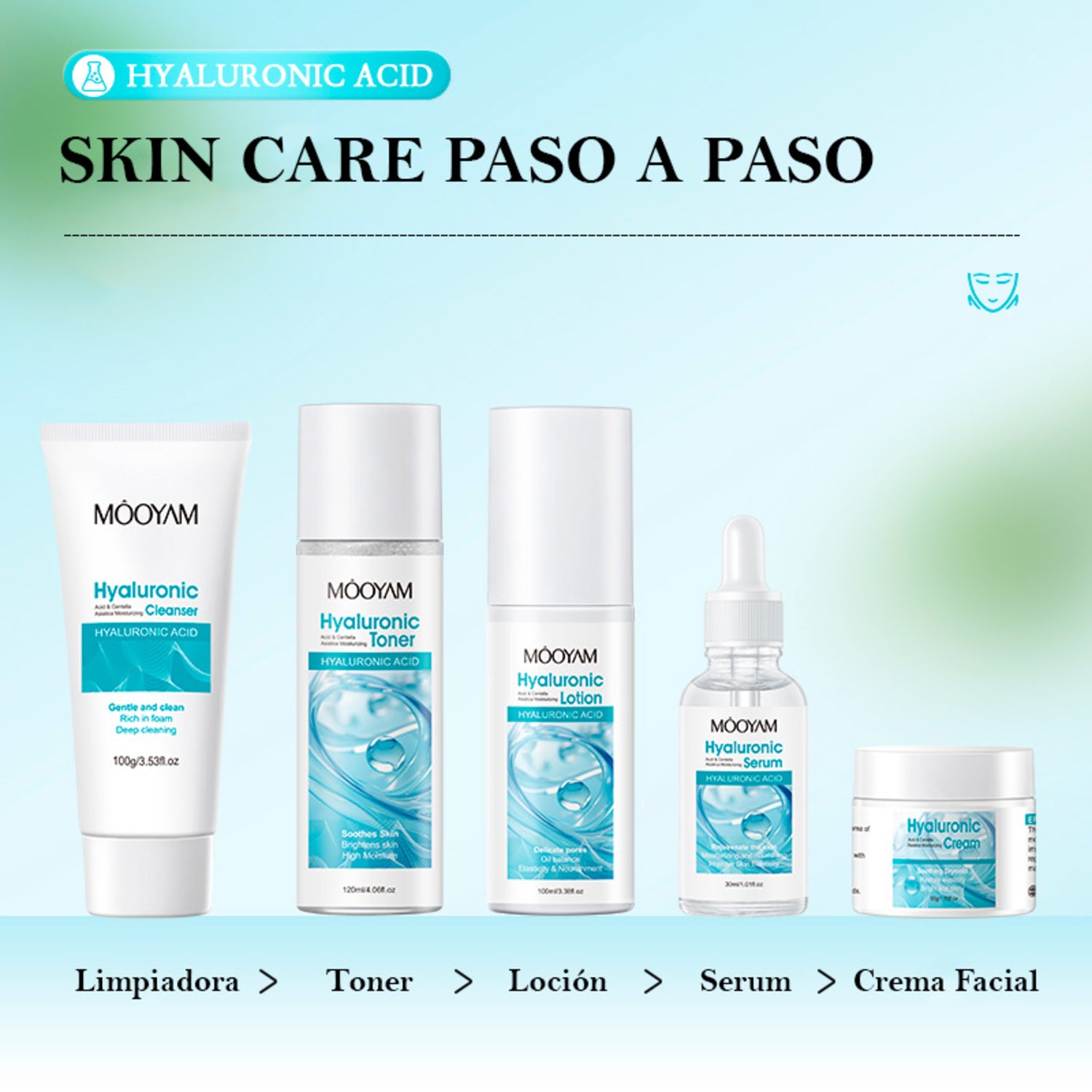 Rutina completa de 5 pasos para una piel visiblemente más hidratada, elástica y luminosa. Incluye limpiador, tónico, loción hidratante y crema nutritiva, formulados con ingredientes inspirados en la cosmética coreana, como el ácido hialurónico y la centella asiática.